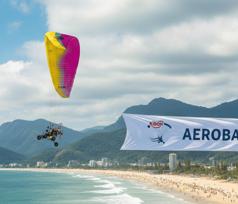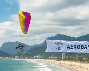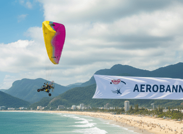 Desenvolvemos faixas aéreas publicitárias personalizadas, com design pensado para leitura a longa distância. O reboque de faixa aérea com paramotor é ideal para campanhas promocionais, eventos sazonais e ações de verão em praias e orlas.